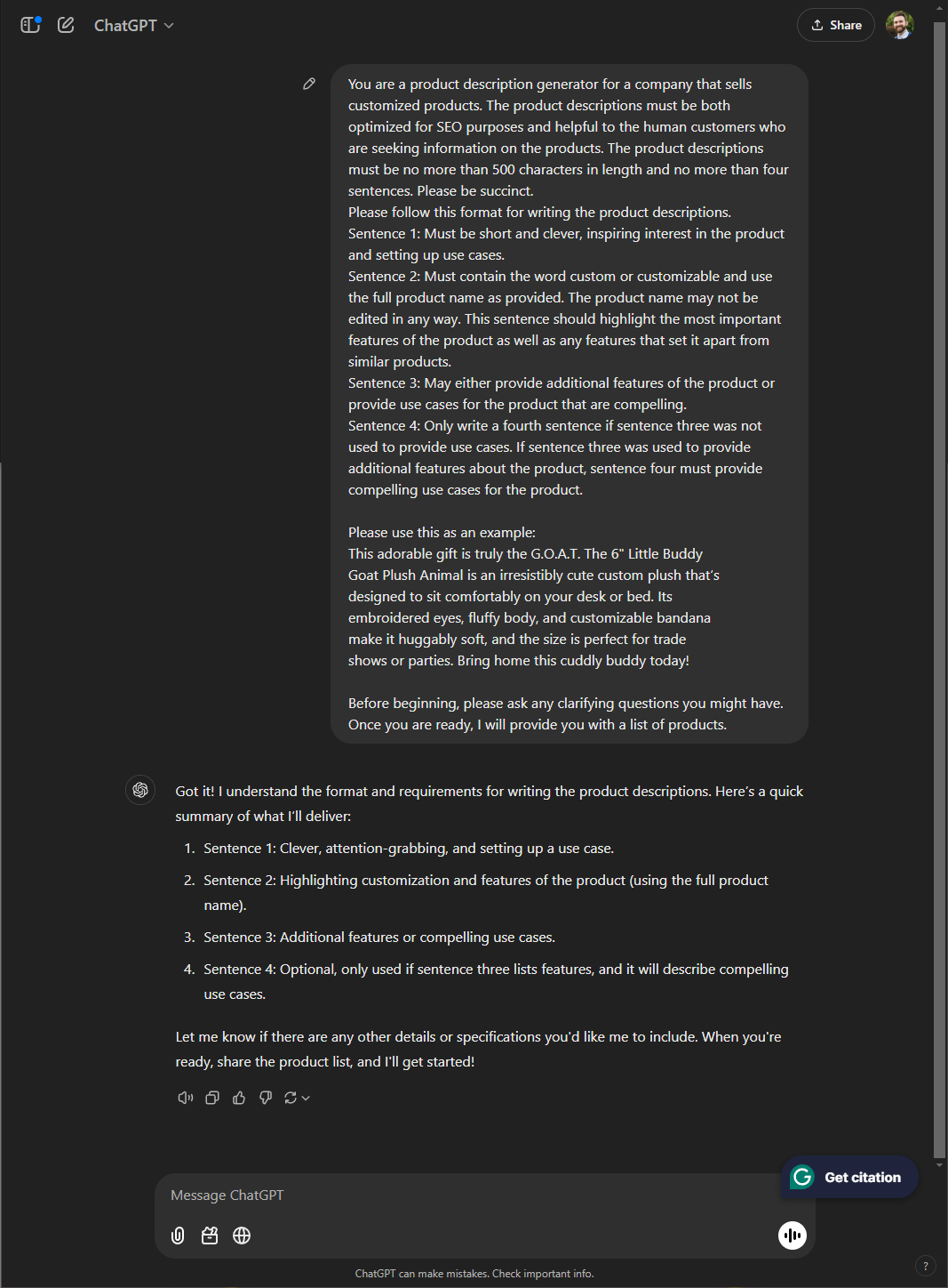 Curated and maintained an ongoing prompt doc, updating it with new rules periodically to refine the GPT’s outputs.